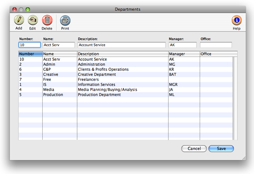 If you’re creating the department table for the first time, use the Auto-Create Departments function by choosing Edit > Auto Create Departments. It checks the user list for department names, then automatically creates a department record for each one it finds. Each department will be numbered automatically, but that number can be changed.