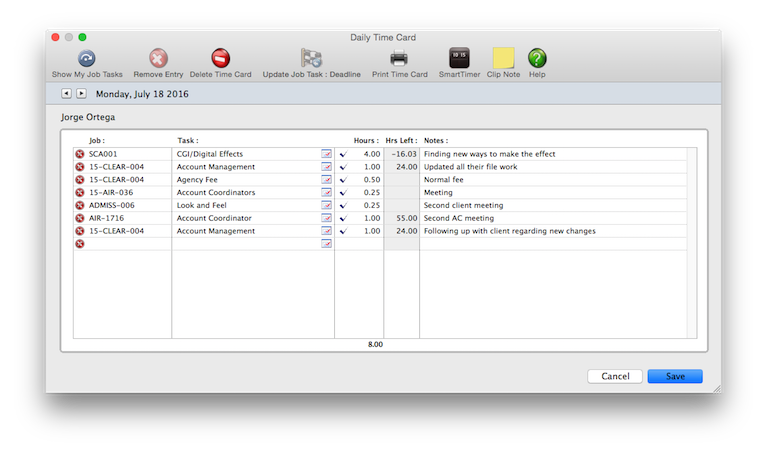 Everyone can track their daily hours using the built-in time card. It keeps a daily record of the jobs and tasks on which you work. You can enter billable and unbillable time for any client, including agency time (i.e., meetings, vacations, etc.).